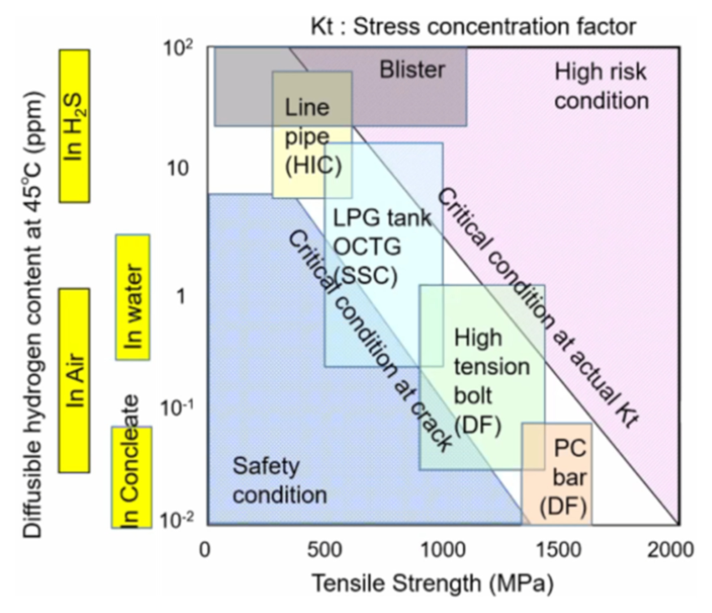 그림 2는 인장강도와 확산성 수소 함량(45 °C 기준)을 축으로 하여 지연파괴(delayed fracture) 또는 수소유기균열의 감수성을 개략적으로 나타낸