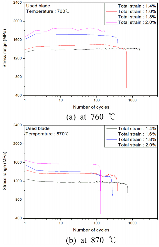 그림 5는 운전하지 않은 신재의 온도에 따른 피로수명동안의 응력변화이며, 그림 6은 장시간 사용된 블레이드 소재의 온도에 따른 피로수명동안의 응력변화를 나타낸 것이다. 운전하지 않은 신재와 장시간 사용된 블레이드는 해당 온도에서
