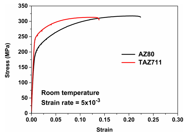 Room temperature tensile stress-strain curves of extruded AZ80 and TAZ711 alloys.