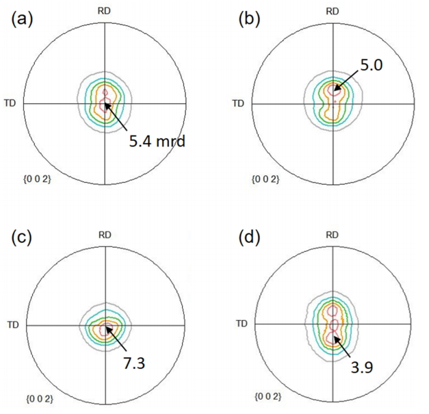 판재의 집합조직은 더 낮은 강도를 나타낸다. 이러한 경향은 그림 6에서 보다 명확히 관찰할 수 있다. 그림 6은 그림 2의 어닐링한 온간 및 냉간 압연 판재의 (0002)면 극점도로부터 ND에서 RD 혹은 TD 방향으로 기울어진 각도(a)에 따라 (0002)면의 극점도