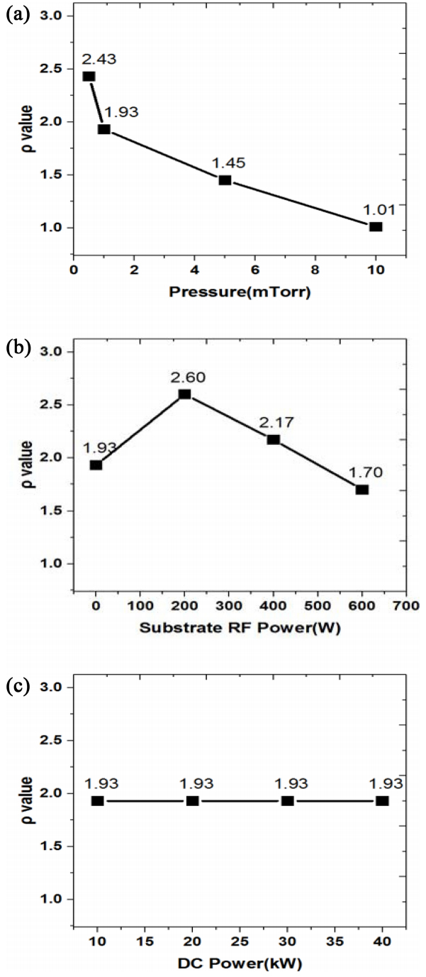 ρ values that were estimated for various sputtering parameters (a) of operation pressure,