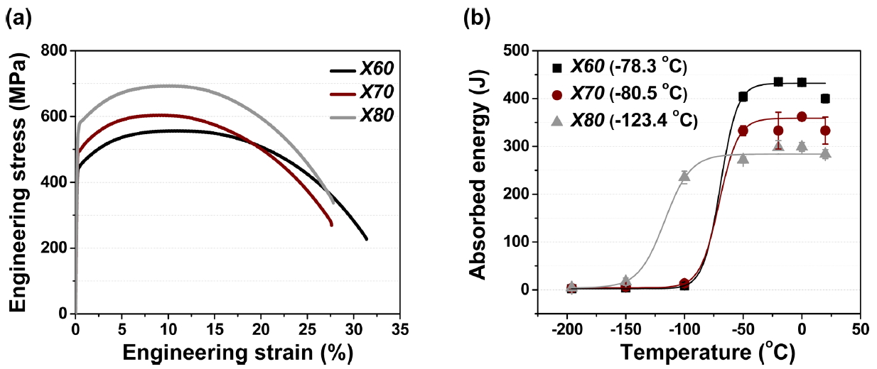 Tensile and Charpy impact properties of the API X60, X70, and X80 pipeline steels.