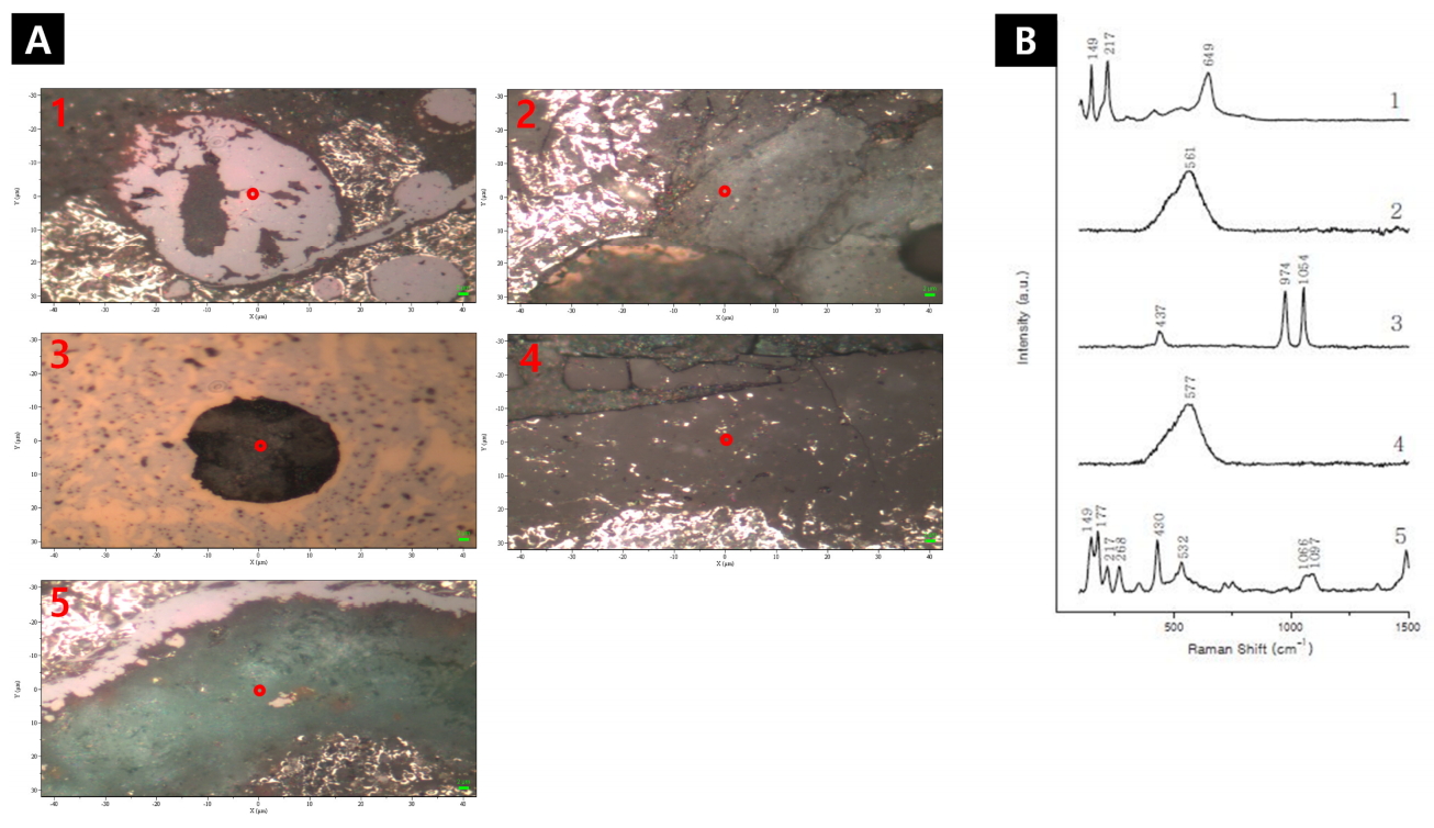 Na-4 Bronze Sword. (A)Raman optic image, (B)Raman spectrum.