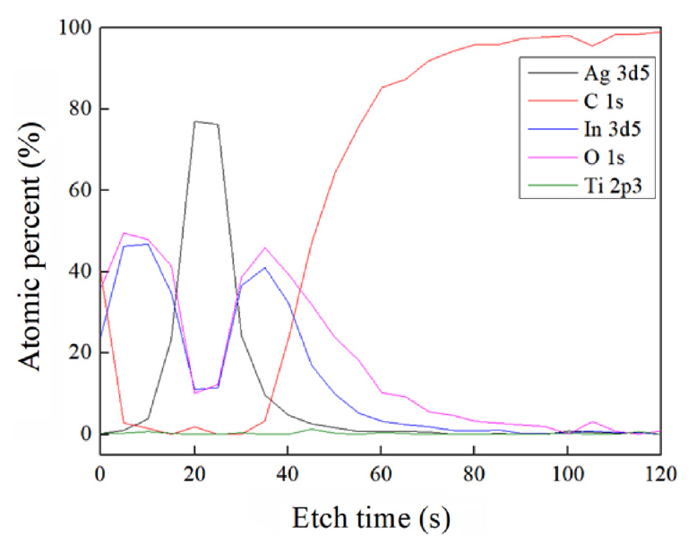 Fig 1에 TAT 박막의 깊이방향 XPS 분석결과를 나타내었다. TIO 박막사이에 Ag 중간층이 삽입되어 있는 것을 확인하였고, 고분자 기판을 사용하였기