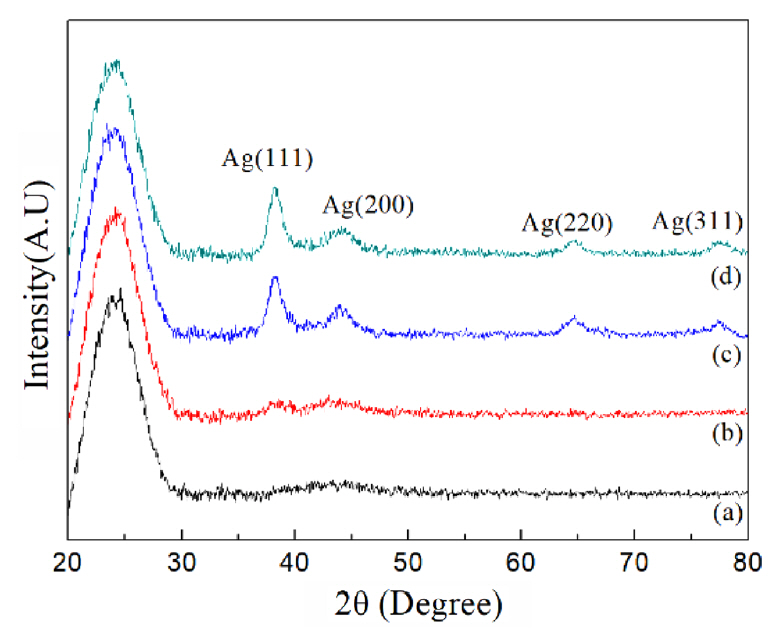 이루어지지 않은 것으로 사료된다. 반면에, Ag 중간층은 두께 10 nm 증착 후, Ag (111) (200), (220), (311) 회절피크가