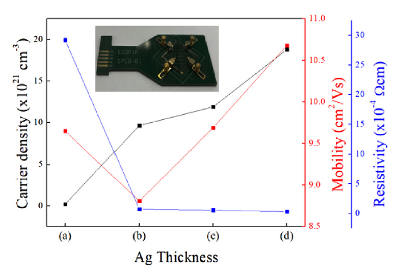 이동을 방해하는 장애물로 작용해 전기적 특성이 낮지만, Ag 층의 두께가 증가함에 따라 연속적인 성막화가 진행되어 전기적 특성이 향상된다 [17]. Ag 중간층의 두께와 비례하여 전하 밀도 및 이동도가 증가하여 TAT(30/15/30 nm) 다층박막에서 가장 낮은 3.12 × 10-5 Ωcm의 비저항이 측정되었다.