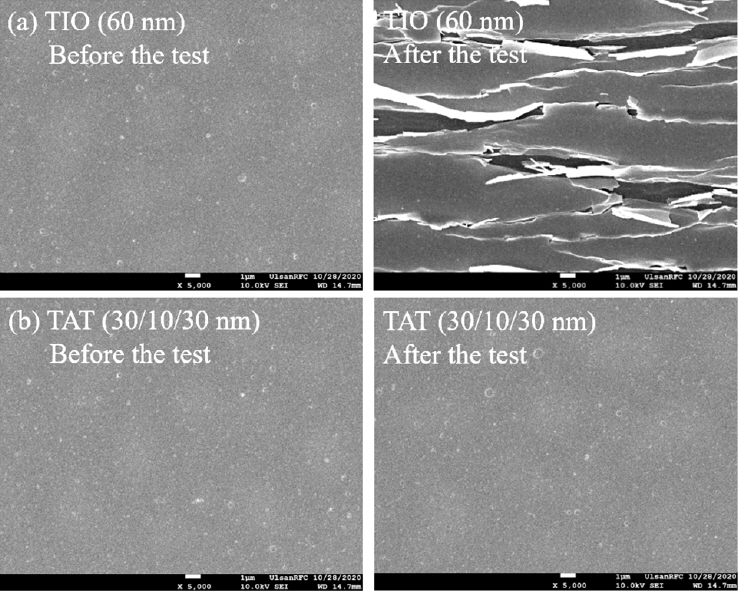 증가하였고, 반면 TAT 다층박막의 경우 저항변화는 최대 1.1배로 우수한 특성을 나타냈다. 저항의 증가 원인을 알아보기 위해 Fig 8에 곡률반경 1.7 mm로 굽힘실험 전, 후 TIO 단층박막과 TAT 다층박막의 표면이미지를 나타내었다. TIO 단층박막(Fig 8(a))에서 굽힘실험 후 표면균열이 관찰되어 저항변화의 원인을 찾을 수 있었다. 반면 TAT 다층박막(Fig 8(b))은 실험 전, 후 표면에 변화가 없음을 확인하여 Ag 중간층이 적층 TCO 전극의 가교(Bridge)역할을 수행함으로써 유연성이 우수한 OMO 구조가