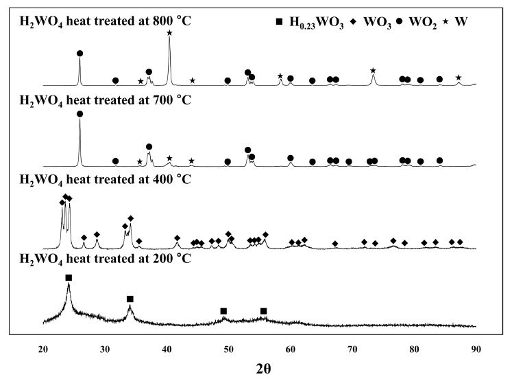 XRD patterns for H2WO4 heat treated in hydrogen at 200~800 °C.