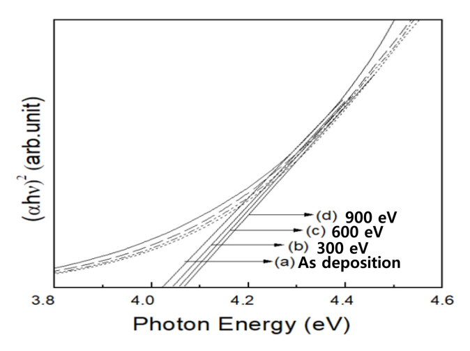 the carrier concentration increased from 2.7 ×1021 (at deposition) to 3.0×1021 cm-3 (at 900 eV).