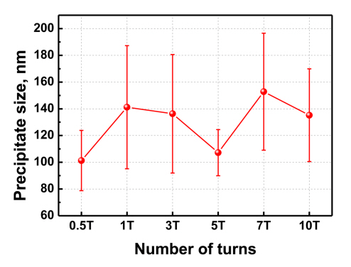 정량적 변화를 확인하기 위해 그림 8과 같이 회전수에 따른 평균 석출물의 크기 변화를 측정했다. 비록 제한된 TEM 시험편 크기로 인해 측정 가능한 석출물의 수의 제약이 있어 큰 error