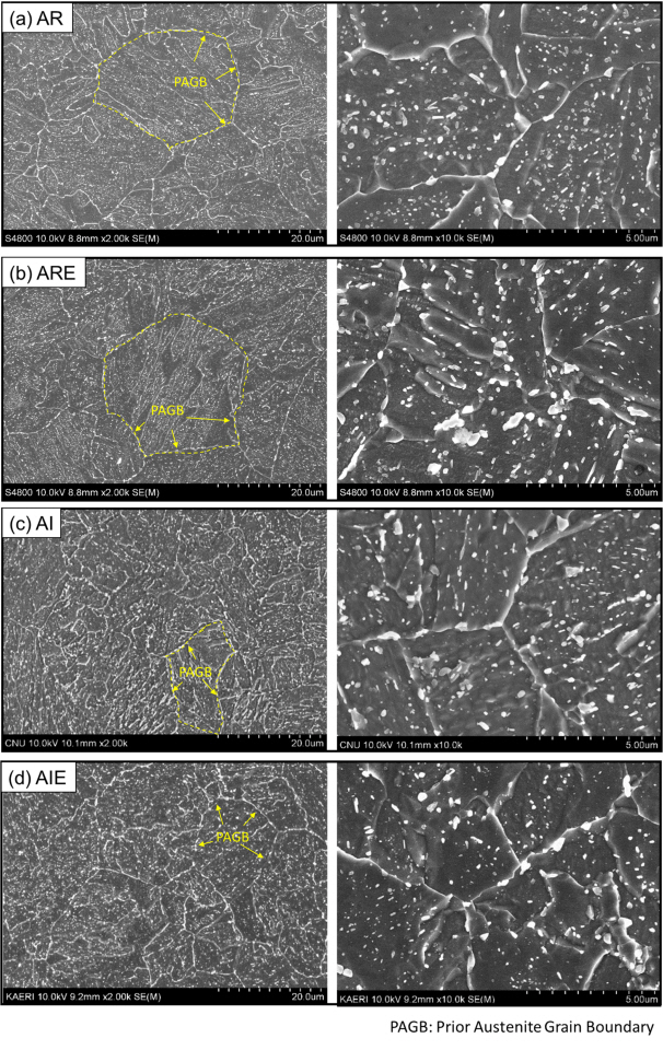 이상영역열처리를 적용한 AI 시편도 AR 시편과 유사한 미세조직을 보여주었으나, 구오스테나이트 결정립크기가 더 미세해졌다. 석출물 크기는 뚜렷한 차이를