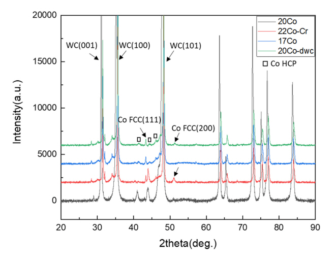 Diffractometer, SmartLab/Rigaku)๋ฅผ ์ฌ์ฉํ์ฌ WC-Co ์ด๊ฒฝ ํฉ๊ธ๋ค์ ์๋ถ์์ ์งํํ์๋ค. ํ๋ธ ์ ์๊ณผ ์ ๋ฅ๋ 45 kV,