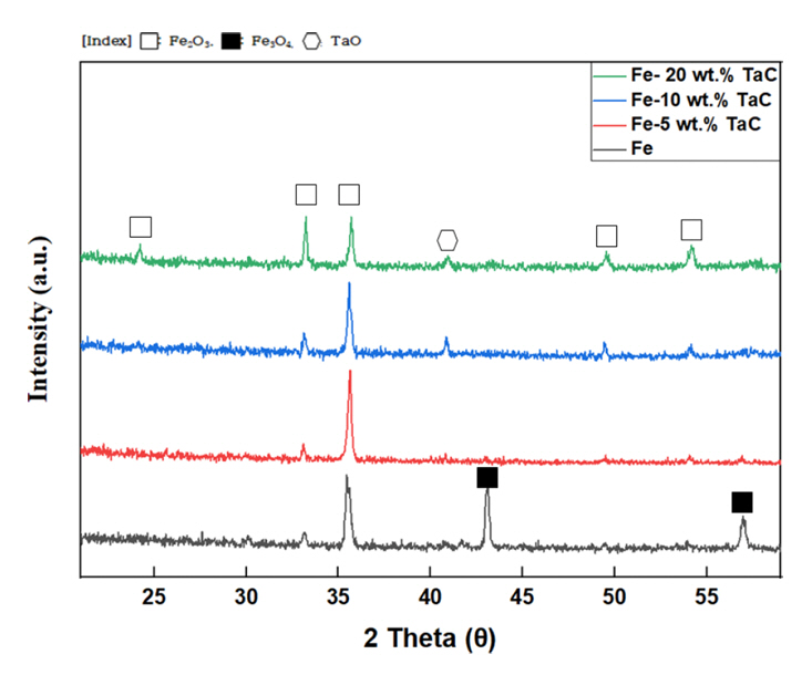 Fe๋ ๋ถ๊ท์นํ ๊ฐํ์ด๋ฉฐ, TaC๋ ๋ถ๊ท์นํ ๋ฏธ๋ฆฝ์ ํํ์ด๋ค. Fe ๋ถ๋ง 100 ์ค๋ ๊ธฐ์ค 5, 10, ๋ฐ 20 ์ค๋ ํผ์ผํธ์ TaC๋ฅผ ์ฒจ๊ฐํ์๊ณ ,