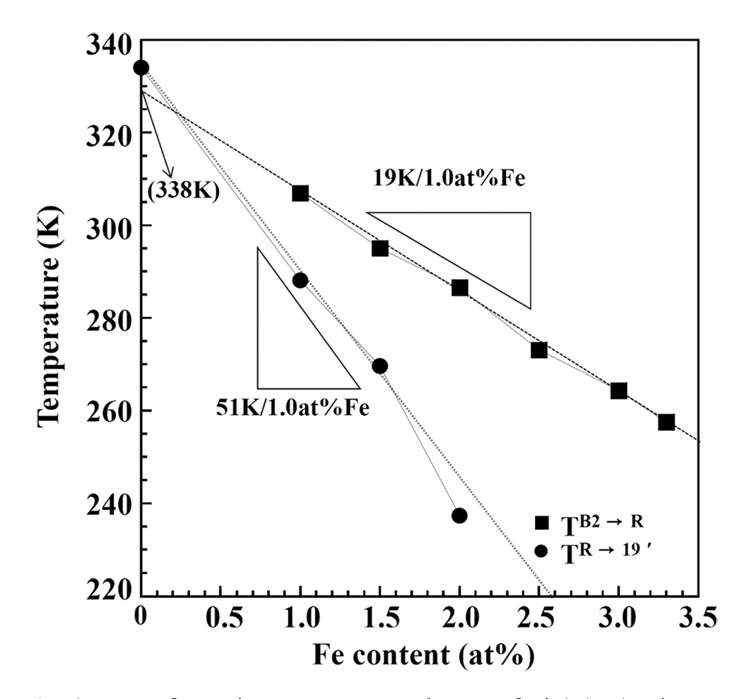 1. Fe 조성의 증가는 TB2→R, TR→B19' 모두를 감소시킨다. DSC결과 1.0at%Fe 증가함에 따라 TB2→R, TR→B19'는 각각 19 K, 51 K 감소한다. Fe 조성 증가에 따라 TB2→R, TR→B19' 간의 폭이 증가하므로 R상이 안정적이게 된다.