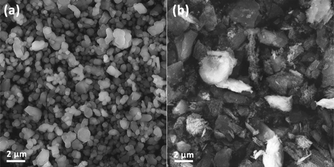 0.5 μm. The MgO powder particles exhibited an irregular block shape of 1-2 μm size.