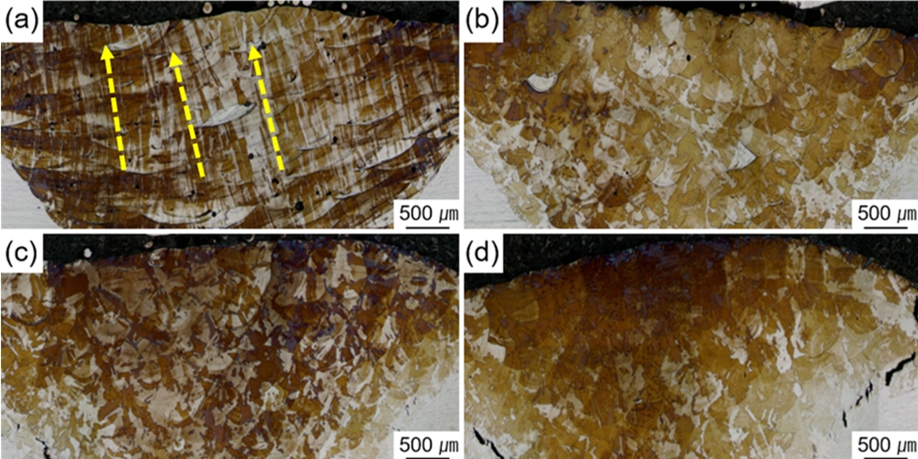 ๊ทธ๋ฆผ 4๋ L-DED ๊ณต์ ์ ์ด์ฉํ์ฌ ์ฉ์ ๋ ์ํธ ๋จ๋ฉด์ ์ฐ๋งํ ํ color etchingํ ํ ๊ด์ฐฐํ ๊ดํํ๋ฏธ๊ฒฝ ์ด๋ฏธ์ง๋ค. ๊ทธ๋ฆผ 4 (b~d)์์ ๋ณผ ์ ์๋ฏ์ด 200W ์ด์์ ๋ ์ด์ ์ถ๋ ฅ์ด ์ฌ์ฉ๋ ์ํธ๋ค์ ๊ฒฝ์ฐ ๋์ฒด๋ก ๊ฒฐ์ ๋ฆฝ์ ์ฑ์ฅ์ด ๋จ์ผ ์ฉ์ตํ์ ๋ด๋ถ์์ ๋๋๋ ๊ฒ์ ๋ฐํด, 150 W์