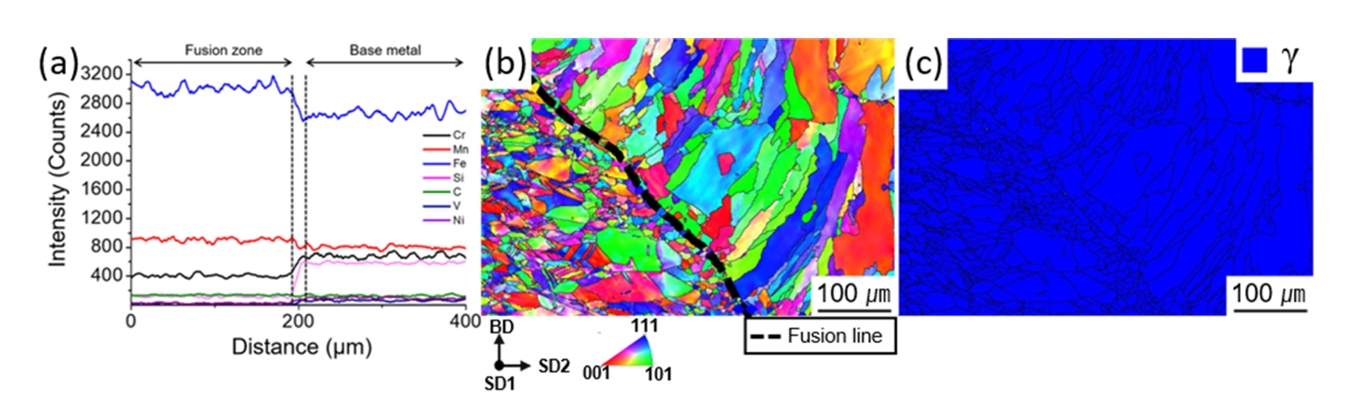 ๊ทธ๋ฆผ 7์ L-DED ๊ณต์ ์ ์ด์ฉํ์ฌ ์ฉ์ ๋ ์ํธ์ ๊ณ๋ฉด์์์ EDS ๋ฐ EBSD ๊ด์ฐฐ ๊ฒฐ๊ณผ๋ค. ๊ทธ๋ฆผ 7 (a)๋ ์ฉ์ ๋ถ์์ ๋ชจ์ฌ๊น์ง์ EDS line scan ๊ฒฐ๊ณผ๋ฅผ ๋ํ๋ด๋๋ฐ, ํ 2์์ ๋ํ๋ธ Cr, Mn, Si, V ๋ฑ ๋ชจ์ฌ์ ์ฉ์ ๋ถ์ ์ฌ์ฉ๋ ์ฉ๊ฐ์ฌ์ ์กฐ์ฑ์ฐจ์ด๋ฅผ ํ์ฐํ ํ์ธํ ์ ์๋ค. ๊ทธ๋ฆผ 7 (b)์ (c)๋ ๊ณ๋ฉด์์์ IPF coloring ์ด๋ฏธ์ง์ phase map์ ๋ํ๋ธ๋ค. ๊ทธ๋ฆผ 7 (b)๋ฅผ ๋ณด๋ฉด ์ฉ์ ๋ถ์ ๊ฒฐ์ ๋ฆฝ๋ค์ ๊ณ๋ฉด์์ ์์งํ๊ฒ ํ์ฑ๋์ด ์ฉ์ ๋ถ์ ์ค์ฌ์ผ๋ก ๊ฐ์๋ก ์ ์ ์ ์ธต ๋ฐฉํฅ์ผ๋ก ์ ๋ ฌ๋๋ ๊ฒ์ ๋ณผ ์ ์์ผ๋ฉฐ, ์ด๋ ์ฉ์ ๋ถ์ ์ค์ฌ์ผ๋ก