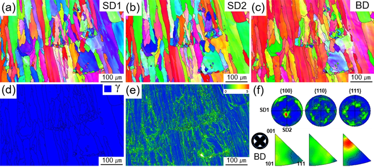 ๊ทธ๋ฆผ 8์ ์ฉ์ ๋ถ ์ค์์ EBSD ๊ด์ฐฐ๊ฒฐ๊ณผ๋ฅผ ๋ํ๋ธ๋ค. ๊ทธ๋ฆผ 8 (a~c)๋ IPF map์ ๋ํ๋ด๋๋ฐ ์ ์ธต ๋ฐฉํฅ์ธ BD๋ฅผ ๋ฐ๋ผ ์ฐ์ ๋ ์ฃผ์์ ์ ๊ฒฐ์ ๋ฆฝ์ด ํ์ฑ๋ ๊ฒ์ ๋ณผ ์ ์๋ค. ๋ํ ๋์ผ ์ธต์ ์ ์ธต ํ ๋ ๋ ์ด์ ๊ฐ