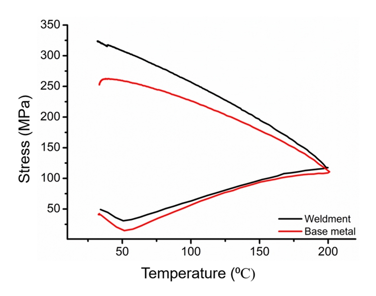 ์ํด ๋ค์ ฮณ-austenite์์ ฮต-martensite๋ก์ ๋ณํ๊ฐ ์ผ์ด๋๋ฉด์ ์๋ ฅ-์จ๋ ๊ณก์ ์ ๊ธฐ์ธ๊ธฐ๊ฐ ์ค์ด๋ค๊ฑฐ๋ ์ฌํ ๊ฒฝ์ฐ ํ๋ณต์๋ ฅ์ด ๊ฐ์ํ๋