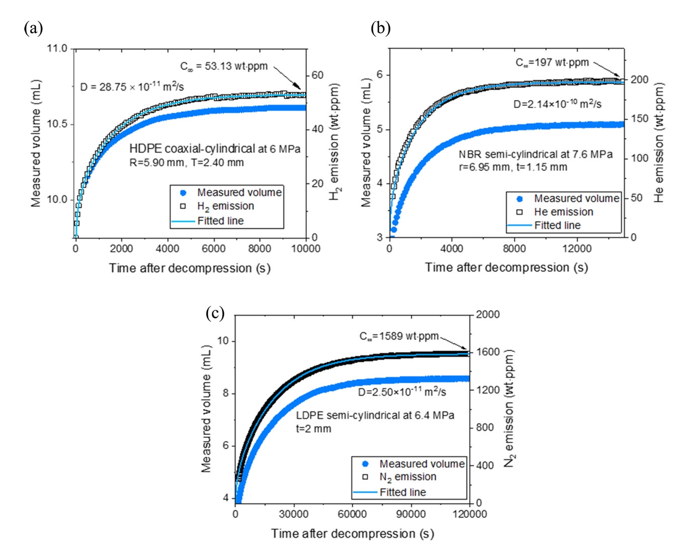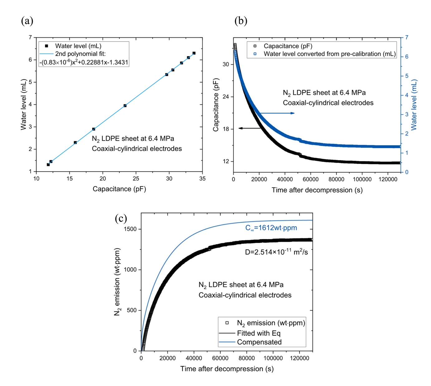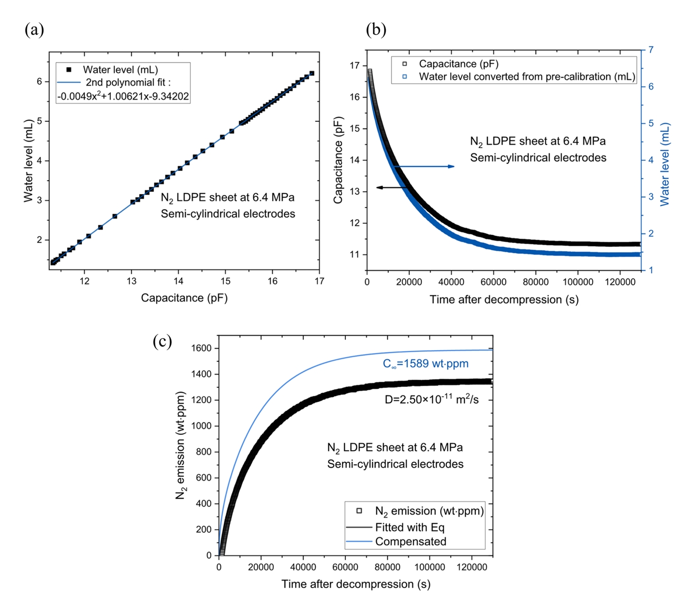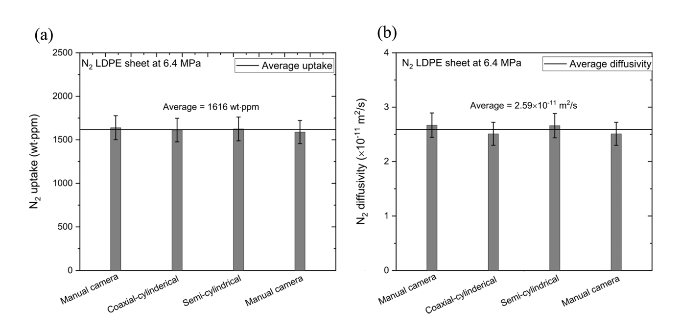 Figures 9 (a) and (b) shows the representative N2 gas uptake (C∞) and diffusivity (D), respectively, for LDPE at 6.4 MPa. These values were compared with the results