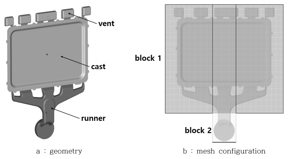수행하였다. 해석 모델은 그림 1과 같이 주조품(cast), 러너(runner), 벤트(vent)로 구성되었고, 격자는 직교좌표계의 구조화 격자계(structured grid)이며,