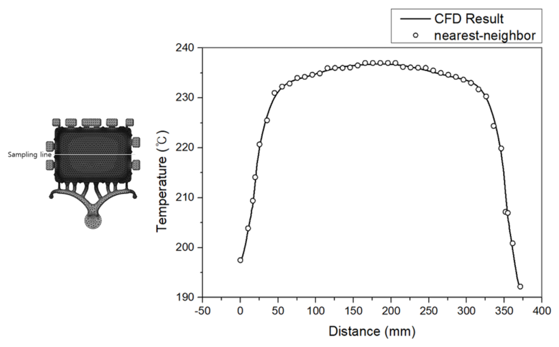 3. IDW 기반 보간을 적용한 결과, CFD 결과와 FEA 입력 온도는 샘플링 라인 상에서 노드 위치별로 일치하는 온도 분포가 나타났다. 기존의