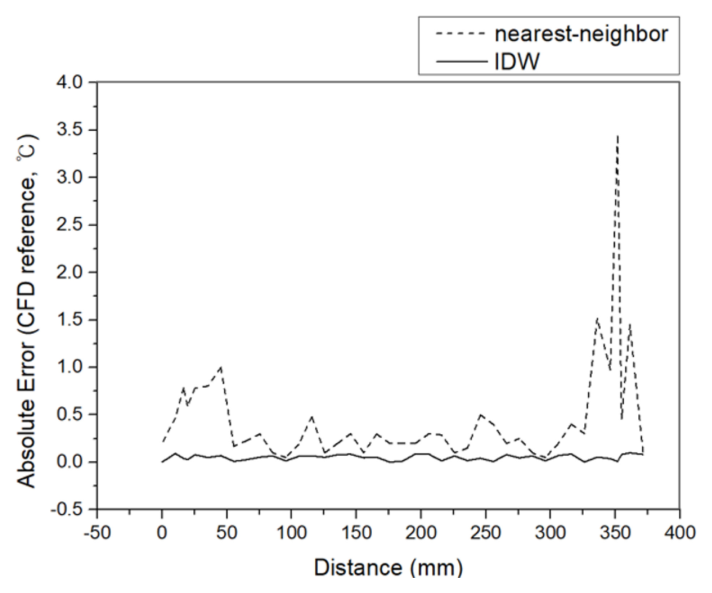 최근접 셀 매핑 방식과 IDW 방식의 절대 오차를 그림 13에 도시하였다. 최근접 셀 매핑 방식의 절대 오차의 최대치는 3.4 oC인 반면 IDW 방식의 경우 모든 위치에서 0.1 oC이하로 나타나 IDW 방식의 안정적인 온도 보간을 확인하였다.