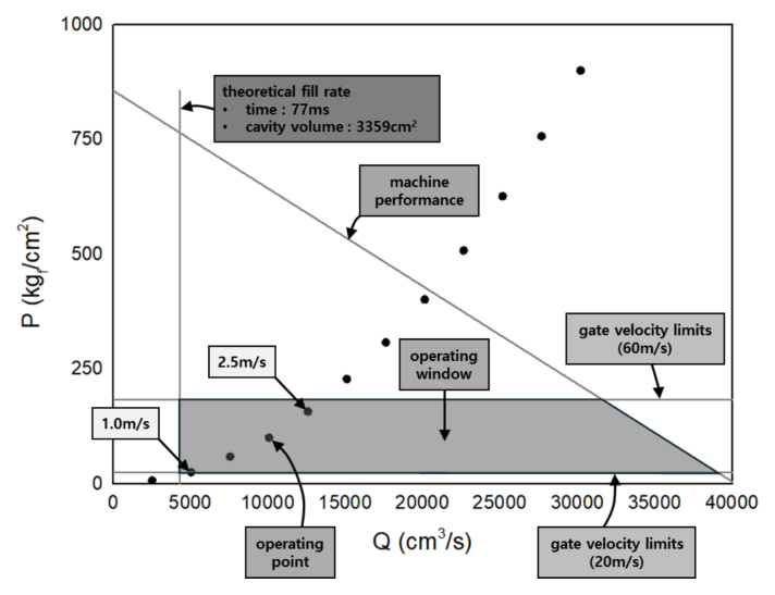 고압 다이캐스팅에 사용될 알루미늄은 ADC12로 해석에 입력되는 물성과 조성[8]을 각각 표 2, 3에 나타내었다. 해석에 사용될 경계조건은 실제 다이캐스팅의 사출속도를 적용하기 위해 A. Abdu 등의 연구[9]를 참고하여 그림 2와 같이 P-Q 선도를 도시하였으며, operating window와 같이 게이트 면적 328 mm2 인 경우 고속 사출속도는 1.0-2.5 m/s를 사용할 수 있는 것으로 계산되었다.