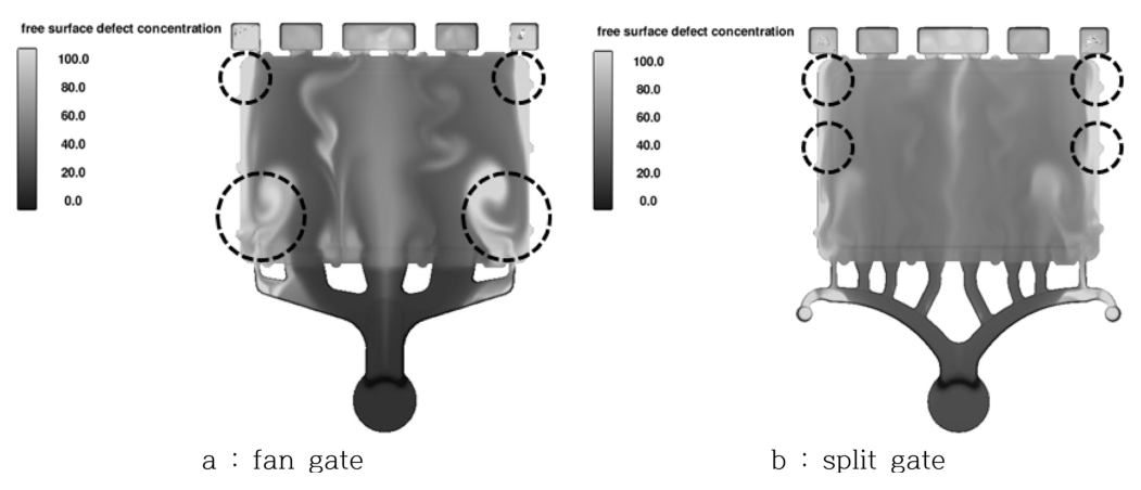 얇은 박판의 경우, 충진되는 용탕 높이의 균일성에 따라 성형성이 우수한 것으로 보고되고 있으며[12], 유동해석 검토 결과 fan gate 방안은 게이트 주변부에 말탕이 발생하고 균일하게 충진되지 않는 것으로 나타났다. 그림 7과 같이 상대적으로 split gate 방안의 용탕 높이 균일성이 높고 그림 8과 같이 산화물 분포에서도 양호한 결과가 나타나 split gate 방안을 선정하였다. 그러나 split gate 방안에서는 제품의 측벽부에 고농도의