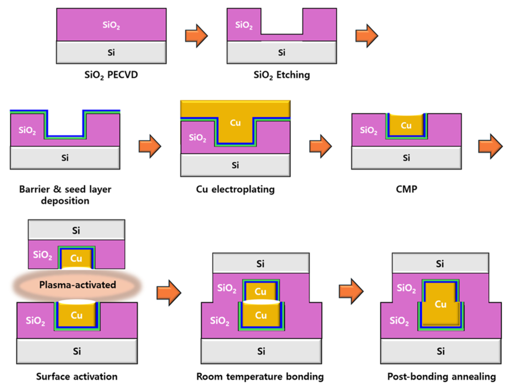 뒤, Cu 전해도금으로 비아를 채우고, CMP로 표면을 평탄화한다. 마지막으로 플라즈마 표면 활성화를 통하여 접합을 준비한 후 실온 접합과 열처리를