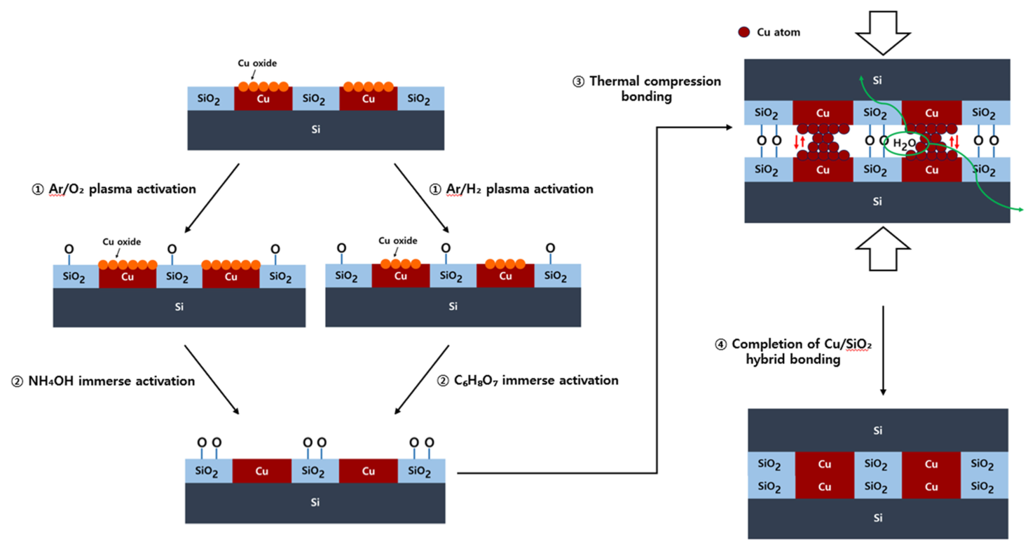 오염 입자를 제거하고 친수성을 부여하는 단계로 시작한다. 이후 SiO2 간 접합이 선행되며, 후속 열처리 공정에서 Cu 간 접합이 진행된다[7]. 거칠거나 돌출된 Cu 표면은 접합시 기공 (void) 발생과 신뢰성 저하의 원인이 될 수 있으므로, CMP 공정을 통하여 Cu 충전부 돌출을 최소화한다.