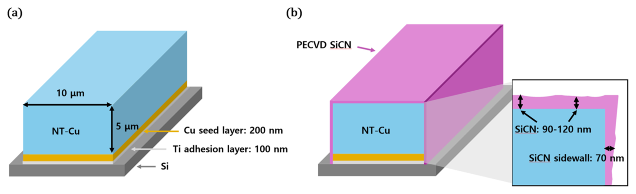 그림 1은 TSV 하이브리드 본딩 공정을 단계별로 나타낸 것이다. 공정은 실리콘 기판 위에 플라즈마 강화 화학 기상 증착 (Plasma-Enhanced Chemical