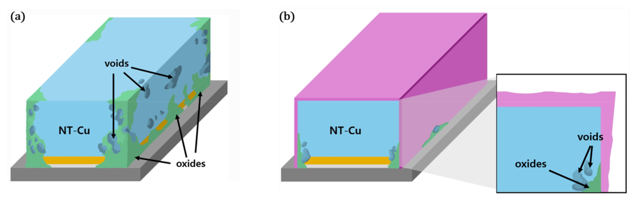 Liu 등[16]은 우수한 Cu 확산성을 가진 Pt를 이용하여 Cu 표면에 10 nm 두께의 Pt 부동태막을 스퍼터링으로 증착한 후, DHF (dilute HF)