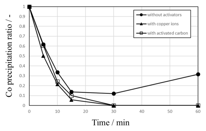 Fig. 4. Effects of activator addition on the Co precipitation during cementation tests