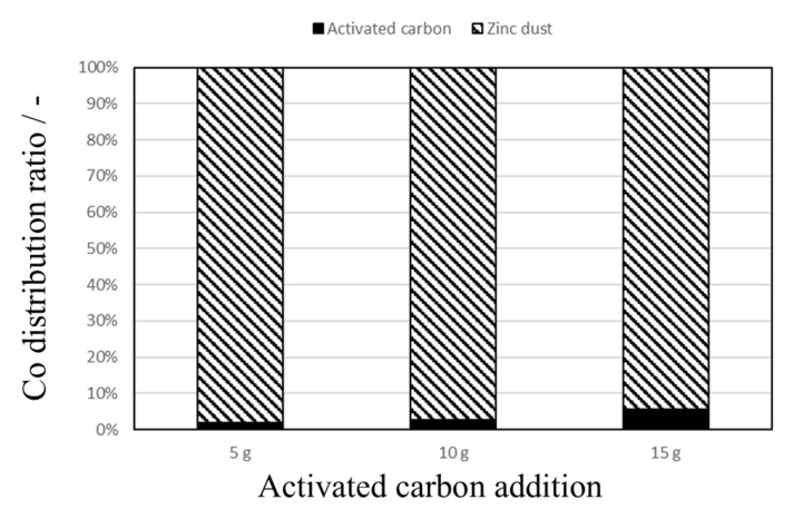 Fig. 9. Cobalt distribution ratio in the zinc dust and activated carbon after cementation
