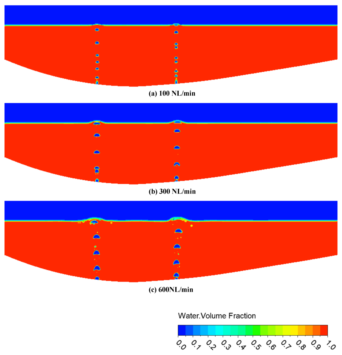 (a) 100 NL/min, (b) 300 NL/min, and (c) 600 NL/min. The simulations were conducted