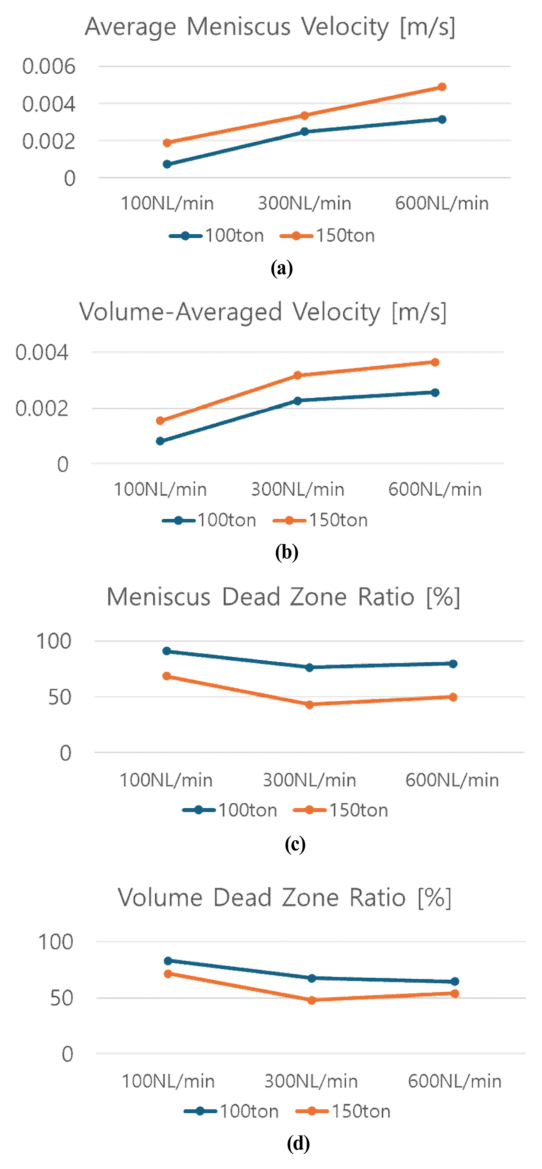 volume-averaged velocity, (c) meniscus dead-zone fraction, and (d) volume dead-zone